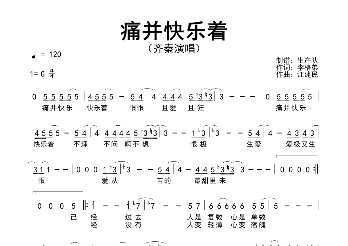 《痛并快乐着》是齐秦演唱的一首歌曲,原版简谱,拍号为4/4拍,歌曲速度为每分钟120拍,这份简谱共有一张高清图谱,图谱由 @生产队 编配上传齐秦演唱的经典歌曲《痛并快乐着》原版简谱。