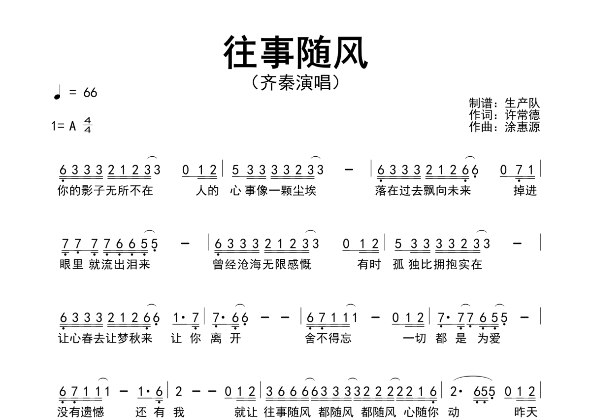 《往事随风》是齐秦演唱的一首歌曲,原版简谱,拍号为4/4拍,歌曲速度为每分钟66拍,这份简谱共有一张高清图谱,图谱由 @生产队 编配上传齐秦演唱的经典歌曲《往事随风》原版简谱。