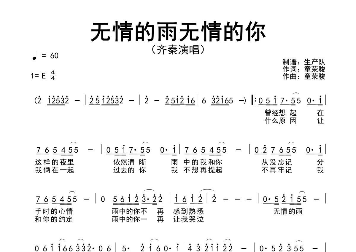 《无情的雨无情的你》是齐秦演唱的一首歌曲,原版简谱,拍号为4/4拍,歌曲速度为每分钟60拍,这份简谱共有一张高清图谱,图谱由 @生产队 编配上传齐秦演唱的经典歌曲《无情的雨无情的你》原版简谱。