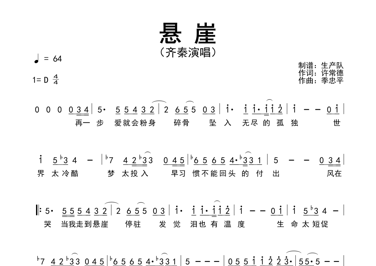 《悬崖》是齐秦演唱的一首歌曲,原版简谱,拍号为4/4拍,歌曲速度为每分钟64拍,这份简谱共有一张高清图谱,图谱由 @生产队 编配上传齐秦演唱的经典歌曲《悬崖》原版简谱。