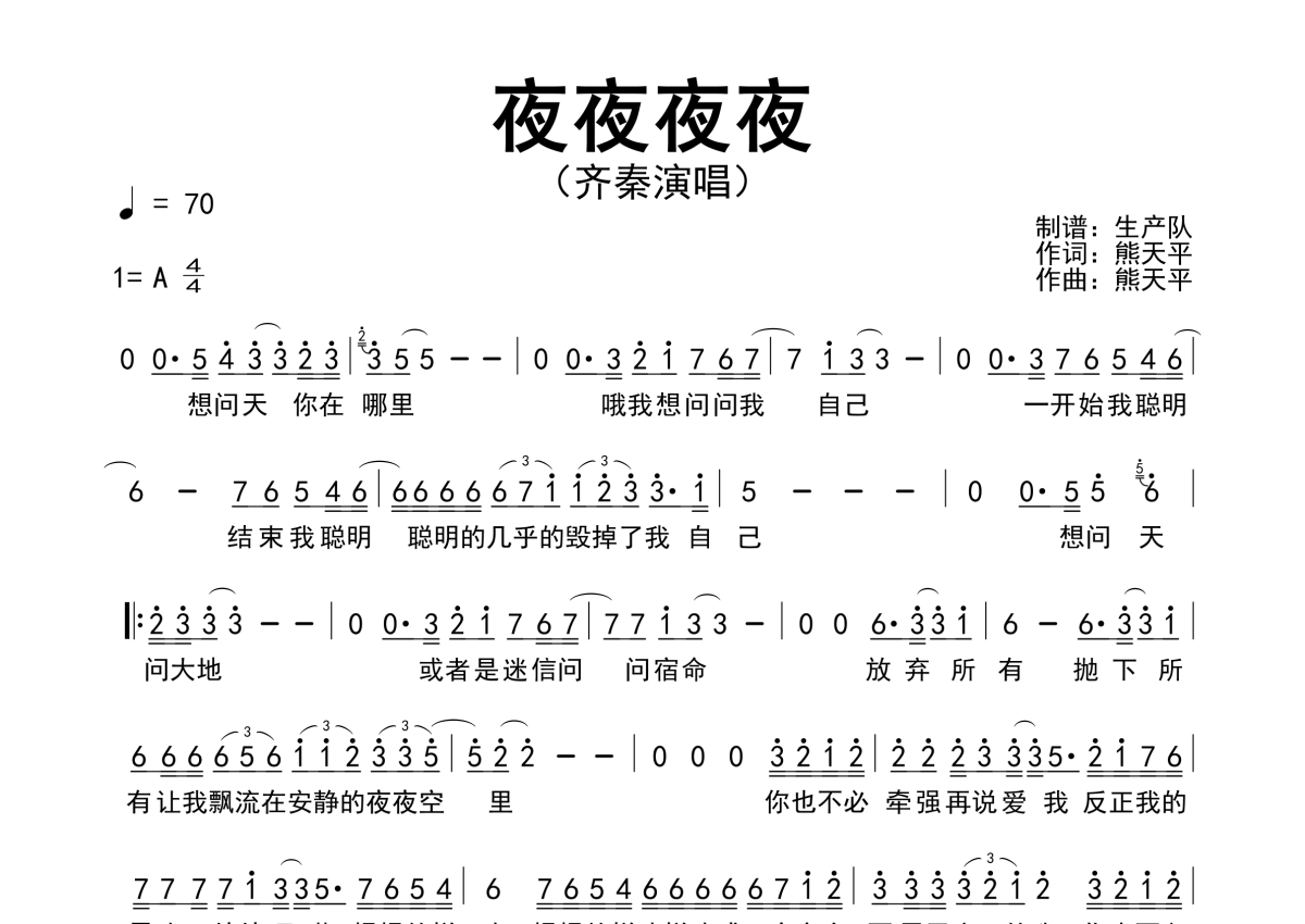《夜夜夜夜》是齐秦演唱的一首歌曲,原版简谱,拍号为4/4拍,歌曲速度为每分钟70拍,这份简谱共有一张高清图谱,图谱由 @生产队 编配上传齐秦演唱的经典歌曲《夜夜夜夜》原版简谱。