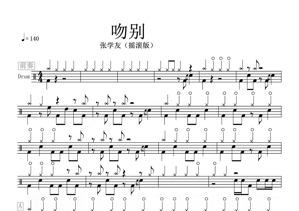 《吻别》是张学友演唱的一首歌曲,这份鼓谱共有四张高清图谱,图谱由 @打鼓谱 编配上传,图谱使用五线谱编配,使用这份吻别架子鼓谱,你将能够轻松地敲打出这首张学友的吻别,快来尝试吧。《吻别》是张学友演唱的一首歌曲,由何启弘作词,殷文琦作曲、编曲,收录在张学友1993年3月5日发行的同名专辑《吻别》中。张学友(Jacky Cheung),1961年7月10日出生于中国香港,祖籍天津市,华语流行乐男歌手、演员、作曲人,毕业于香港崇文英文书院。