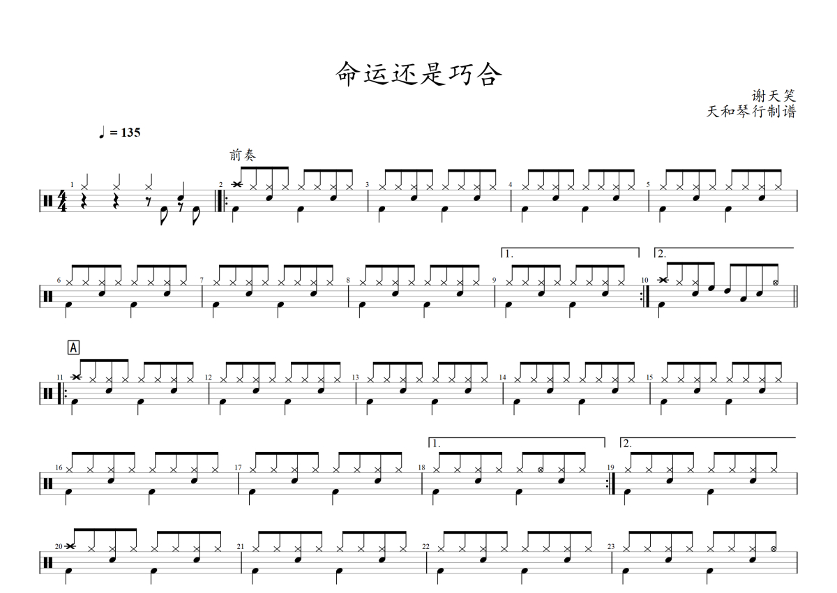 《命运还是巧合》是谢天笑演唱的一首歌曲,拍号为4/4拍,歌曲速度为每分钟135拍,这份架子鼓谱共有两张高清图谱,图谱由 @音符喷血者 编配上传,图谱使用五线谱编配,使用这份命运还是巧合架子鼓谱,你将能够轻松地敲打出这首谢天笑的命运还是巧合,快来尝试吧。
