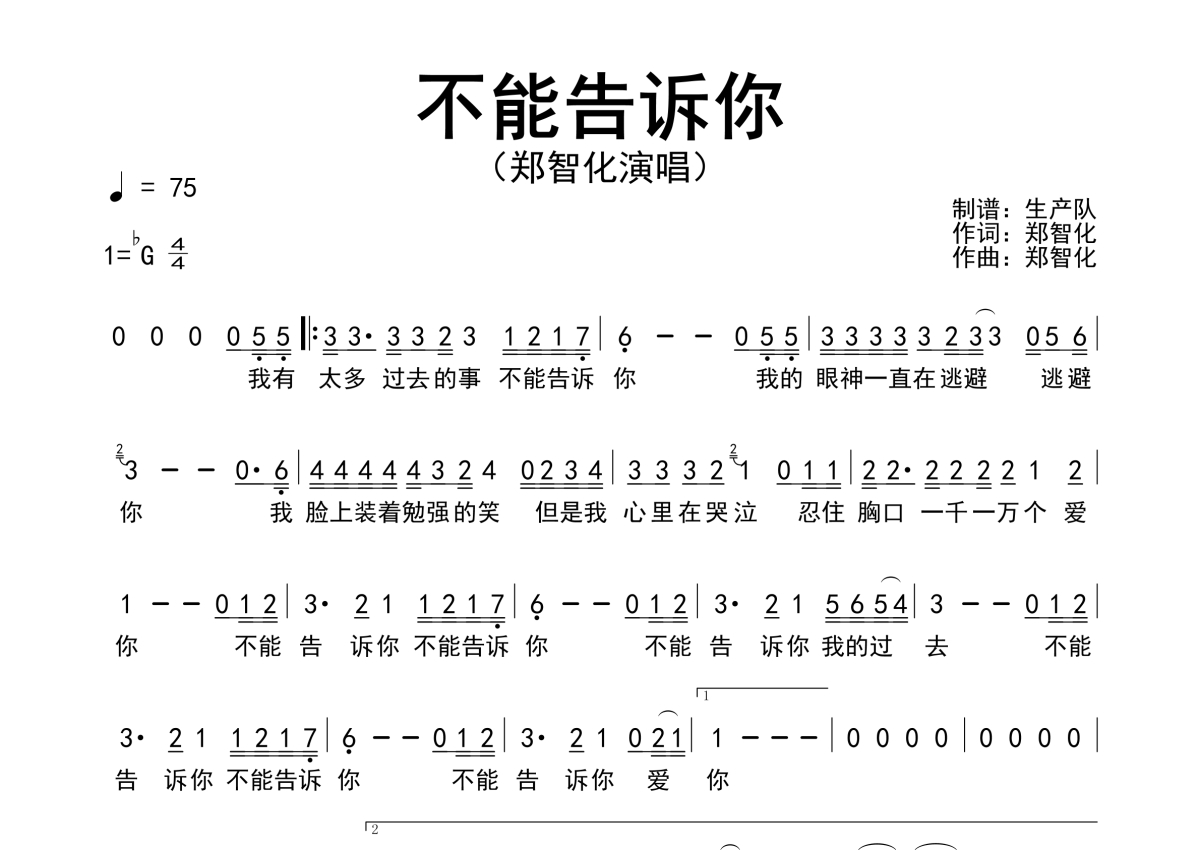 《不能告诉你》是郑智化演唱的一首歌曲,原版简谱,拍号为4/4拍,歌曲速度为每分钟75拍,这份简谱共有一张高清图谱,图谱由 @生产队 编配上传郑智化演唱经典歌曲《不能告诉你》原版简谱。