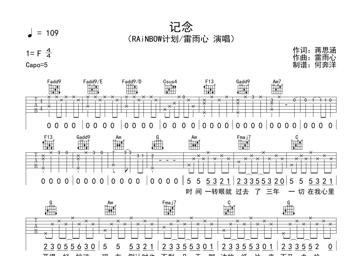 《纪念》是雷雨心演唱的一首歌曲,本吉他谱采用的是C调指法编配,这份吉他谱共有两张高清图谱,图谱由 @何奔洋 编配上传,图谱使用六线谱编配,包含吉他和弦指法、简谱以及歌词部分,使用这份纪念吉他谱,可以让你更加方便地掌握这首歌曲的弹唱技巧,快来尝试吧。雷雨心《纪念》吉他谱_C调吉他弹唱谱。