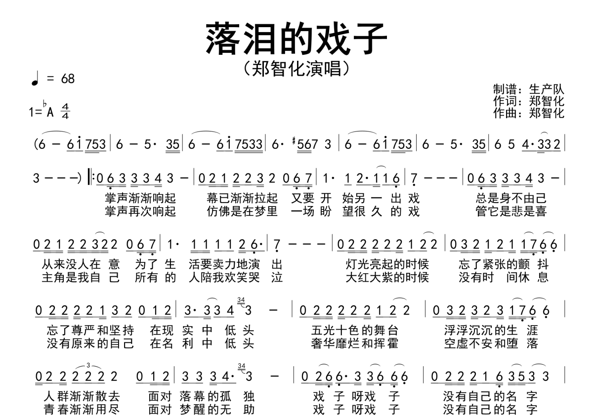 《落泪的戏子》是郑智化演唱的一首歌曲,原版简谱,拍号为4/4拍,歌曲速度为每分钟68拍,这份简谱共有一张高清图谱,图谱由 @生产队 编配上传郑智化演唱经典歌曲《落泪的戏子》原版简谱。