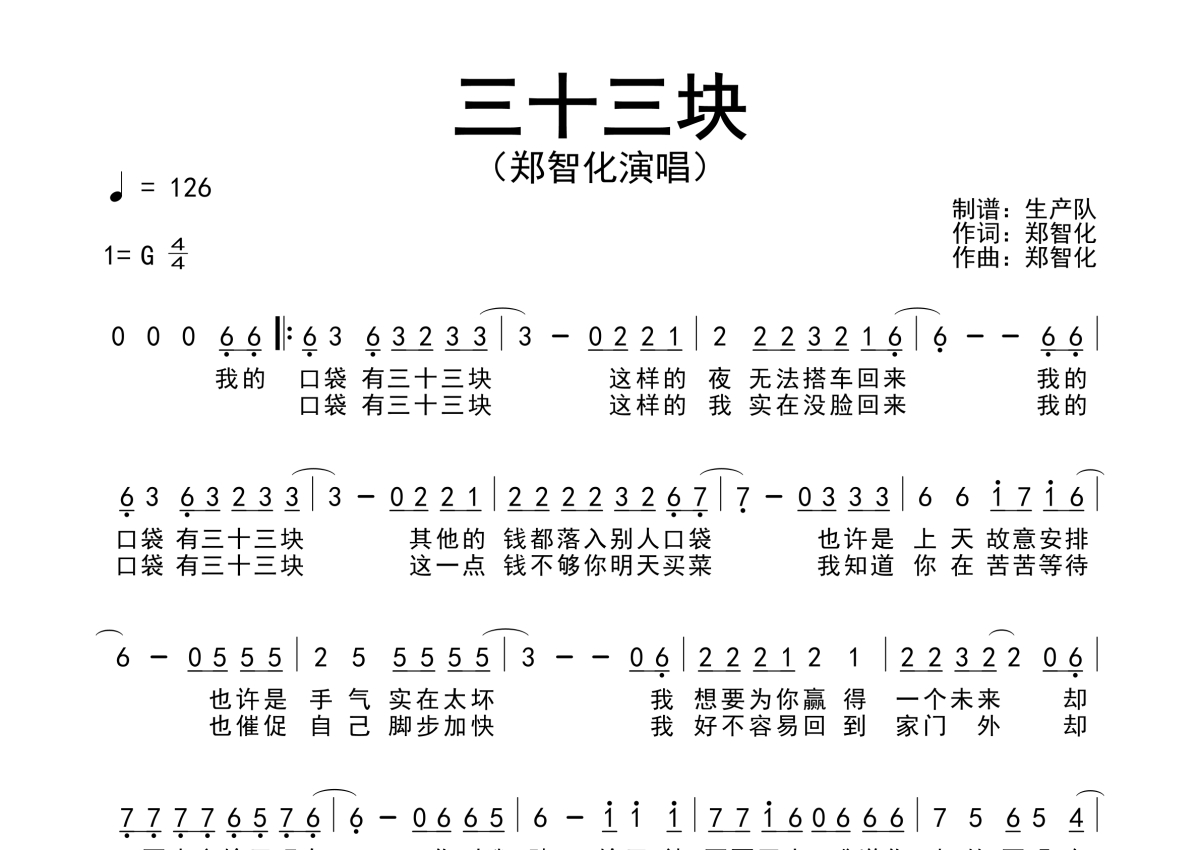 《三十三块》是郑智化演唱的一首歌曲,原版简谱,拍号为4/4拍,歌曲速度为每分钟126拍,这份简谱共有一张高清图谱,图谱由 @生产队 编配上传郑智化演唱经典歌曲《三十三块》原版简谱。