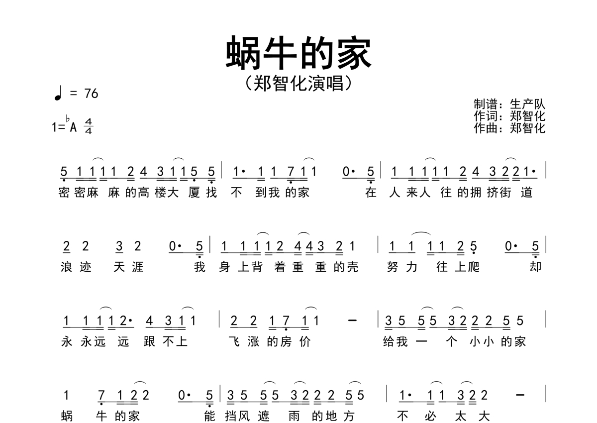 《蜗牛的家》是郑智化演唱的一首歌曲,原版简谱,拍号为4/4拍,歌曲速度为每分钟76拍,这份简谱共有一张高清图谱,图谱由 @生产队 编配上传郑智化演唱经典歌曲《蜗牛的家》原版简谱。