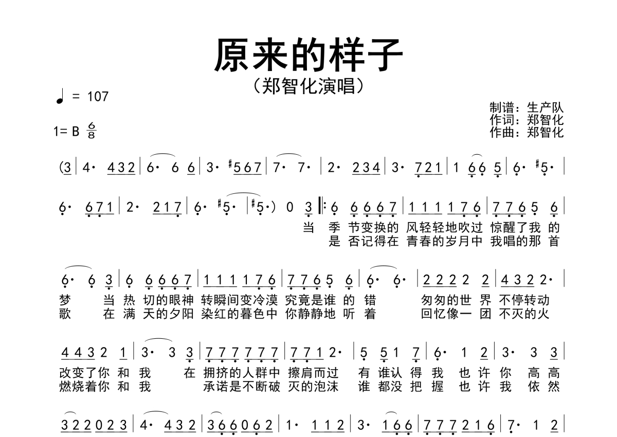 《原来的样子》是郑智化演唱的一首歌曲,原版简谱,拍号为6/8拍,歌曲速度为每分钟107拍,这份简谱共有一张高清图谱,图谱由 @生产队 编配上传郑智化演唱经典歌曲《原来的样子》原版简谱。