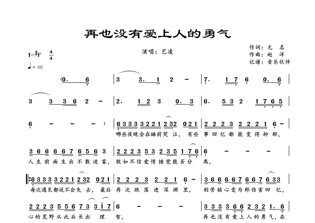 《再也没有爱上人的勇气》是艺凌演唱的一首歌曲,拍号为4/4拍,歌曲速度为每分钟60拍,这份简谱共有一张高清图谱,图谱由 @音乐伙伴 编配上传。