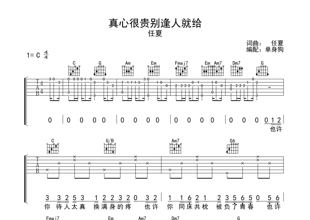 真心很贵别逢人就给吉他谱 - 任夏 - C调弹唱六线谱