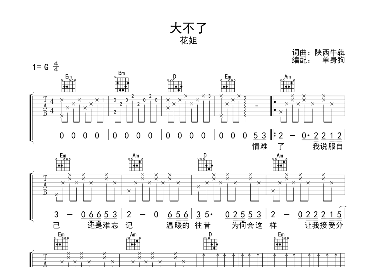 《大不了》是花姐演唱的一首歌曲,拍号为4/4拍,歌曲原调为G调,本吉他谱采用的是G调指法编配,演奏时不需要使用变调夹即为原调,这份吉他谱共有两张高清图谱,图谱由 @单身狗 编配上传,图谱使用六线谱编配,包含吉他和弦指法、简谱以及歌词部分,使用这份大不了吉他谱,可以让你更加方便地掌握这首歌曲的弹唱技巧,快来尝试吧。