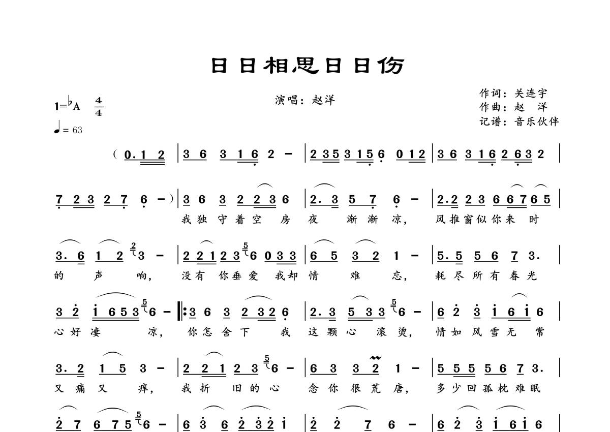 《日日相思日日伤》是赵洋演唱的一首歌曲,拍号为4/4拍,歌曲速度为每分钟63拍,这份简谱共有一张高清图谱,图谱由 @音乐伙伴 编配上传。