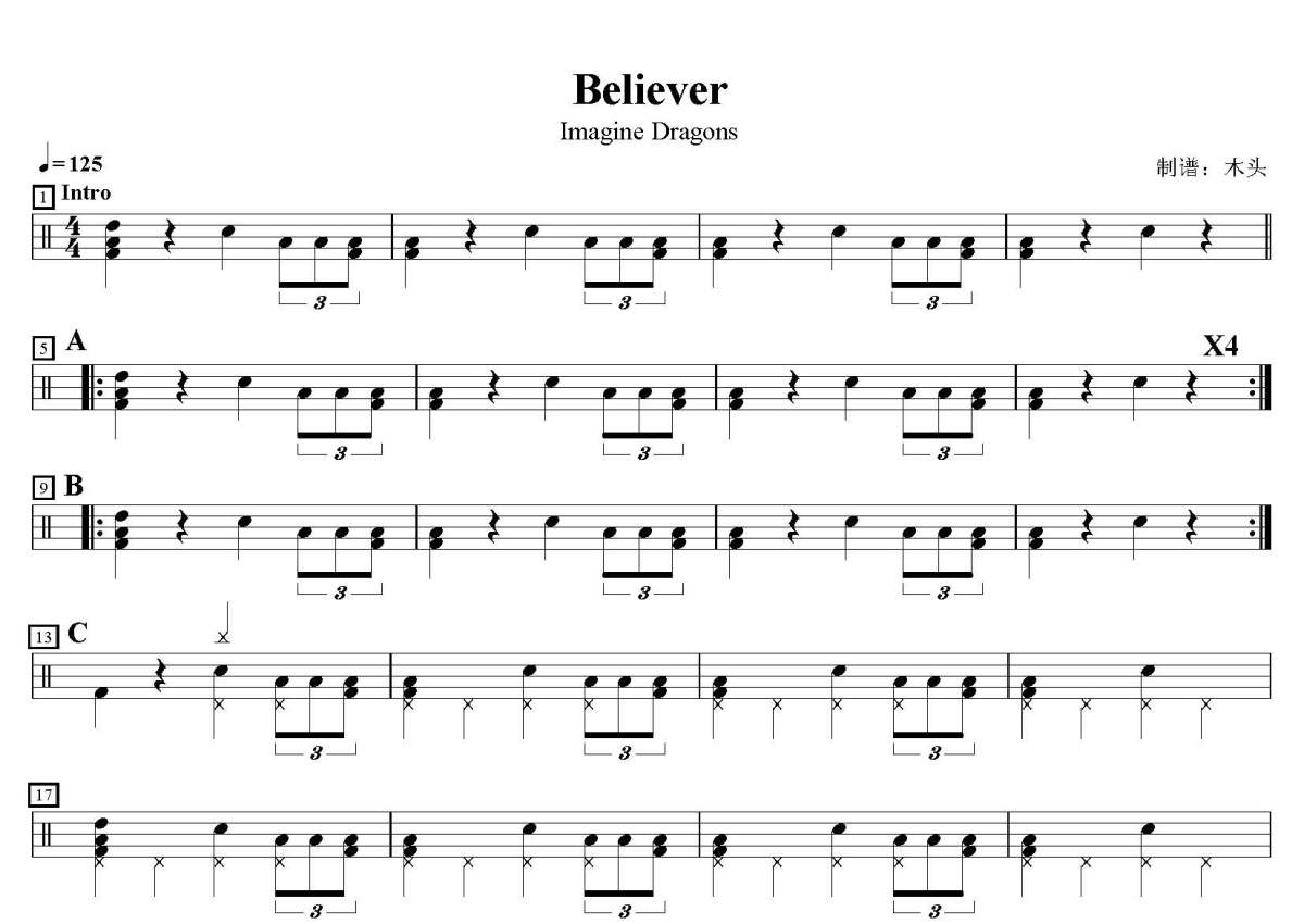Imagine Dragons《Believer》鼓谱 - 架子鼓谱