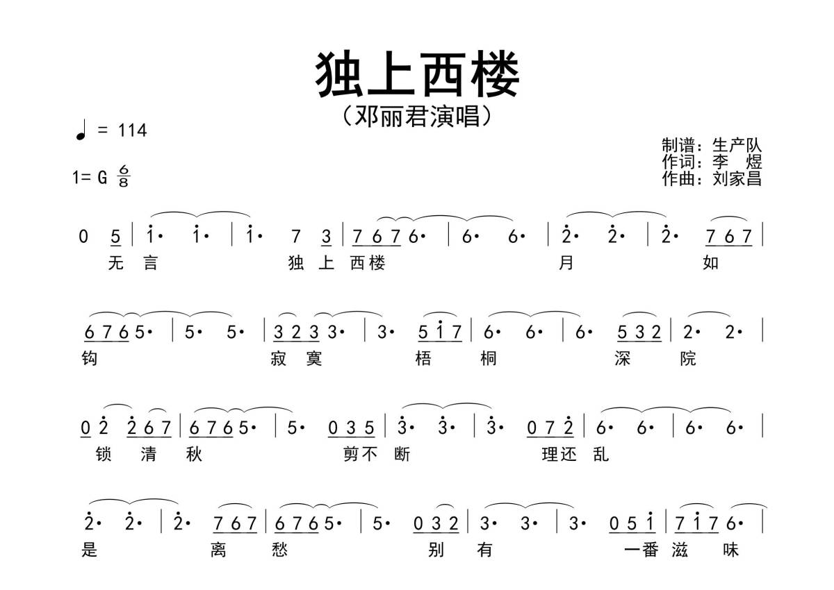《独上西楼》是邓丽君演唱的一首歌曲,原版简谱,拍号为6/8拍,歌曲速度为每分钟114拍,这份简谱共有一张高清图谱,图谱由 @生产队 编配上传邓丽君演唱的经典歌曲《独上西楼》原版简谱。