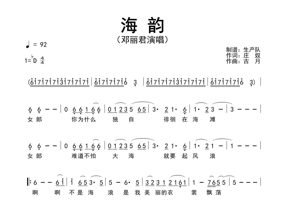 《海韵》是邓丽君演唱的一首歌曲,原版简谱,拍号为4/4拍,歌曲速度为每分钟92拍,这份简谱共有一张高清图谱,图谱由 @生产队 编配上传邓丽君演唱的经典歌曲《海韵》原版简谱。