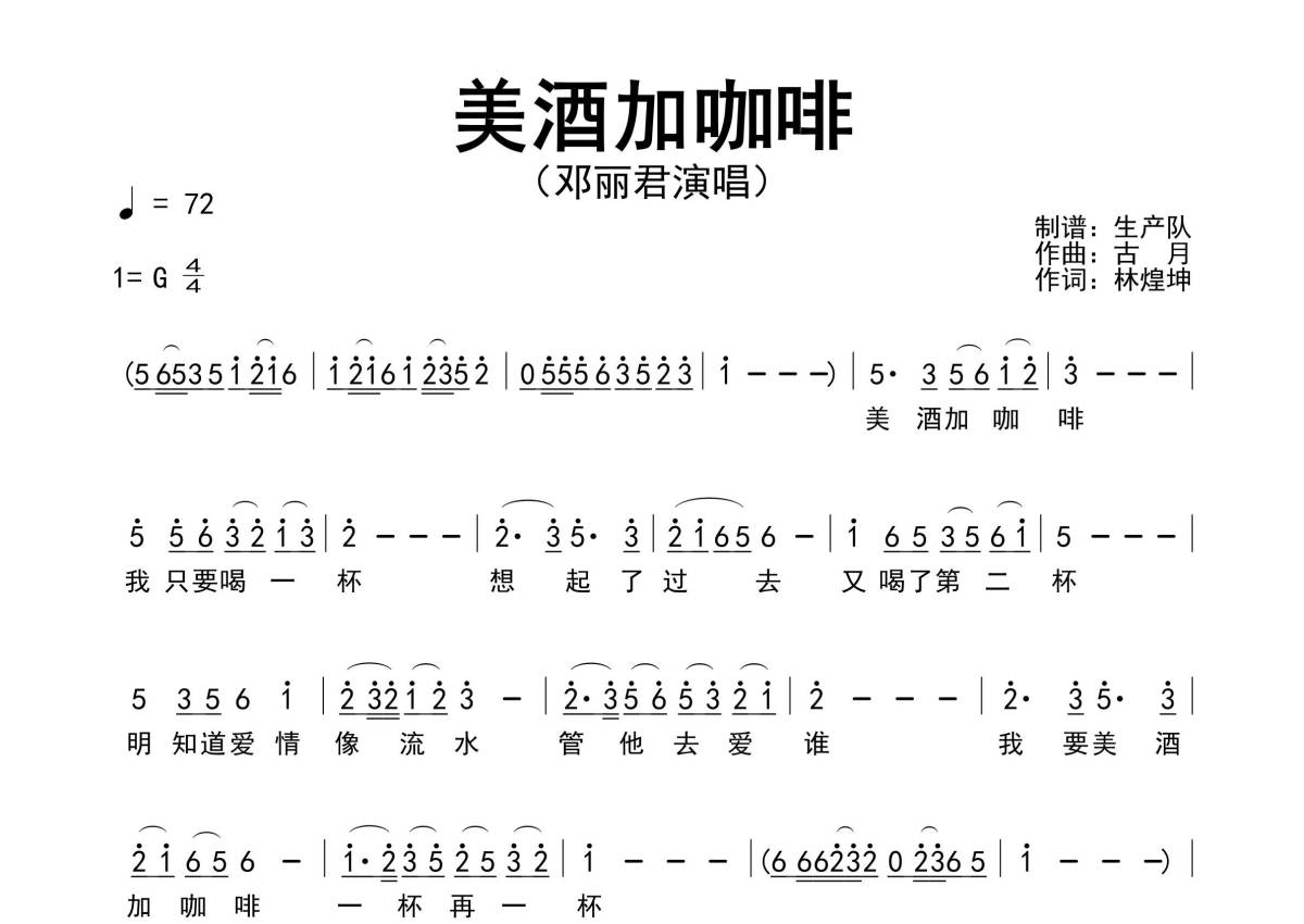 《美酒加咖啡》是邓丽君演唱的一首歌曲,原版简谱,拍号为4/4拍,歌曲速度为每分钟72拍,这份简谱共有一张高清图谱,图谱由 @生产队 编配上传邓丽君演唱的经典歌曲《美酒加咖啡》原版简谱。