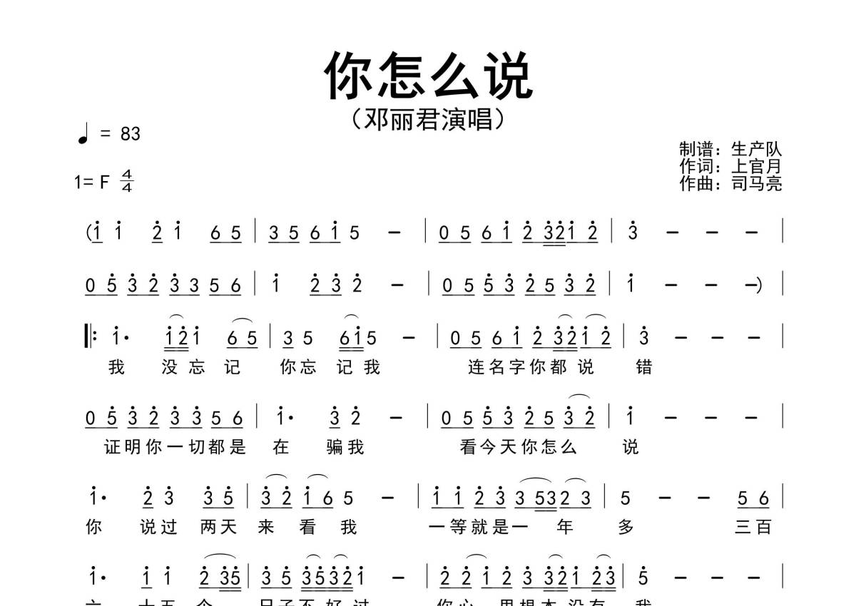 《你怎么说》是邓丽君演唱的一首歌曲,原版简谱,拍号为4/4拍,歌曲速度为每分钟83拍,这份简谱共有一张高清图谱,图谱由 @生产队 编配上传邓丽君演唱的经典歌曲《你怎么说》原版简谱。