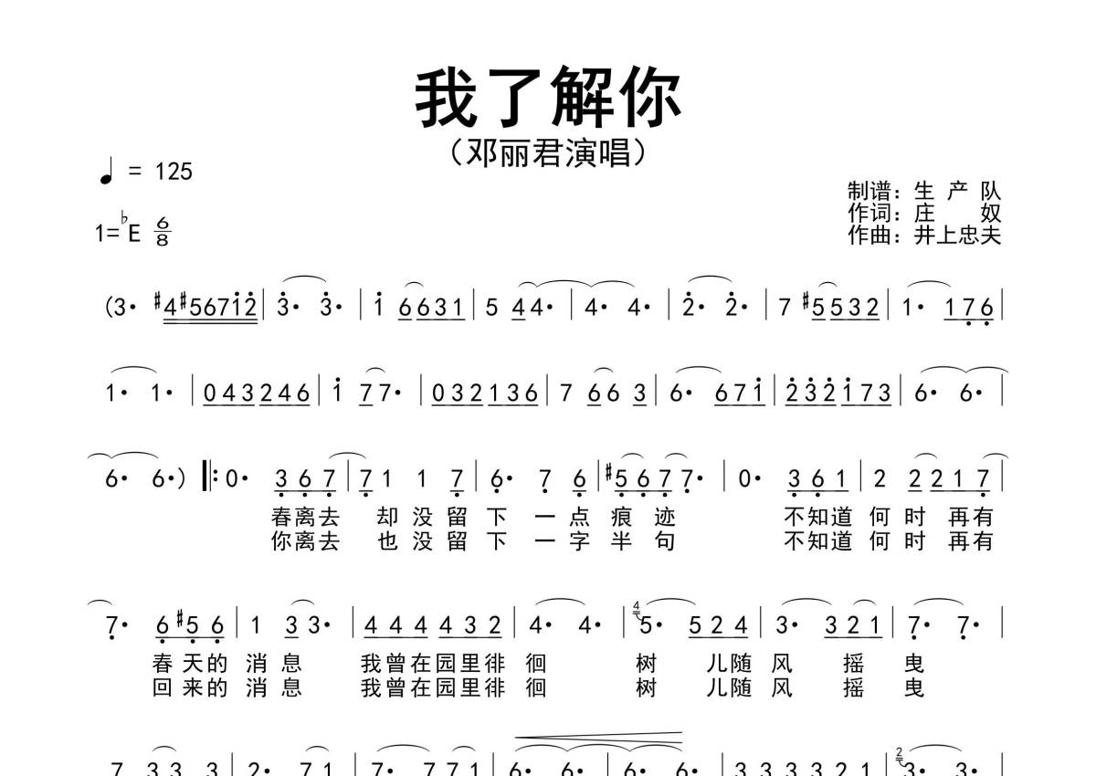 《我了解你》是邓丽君演唱的一首歌曲,原版简谱,拍号为6/8拍,歌曲速度为每分钟125拍,这份简谱共有一张高清图谱,图谱由 @生产队 编配上传邓丽君演唱的经典歌曲《我了解你》原版简谱。