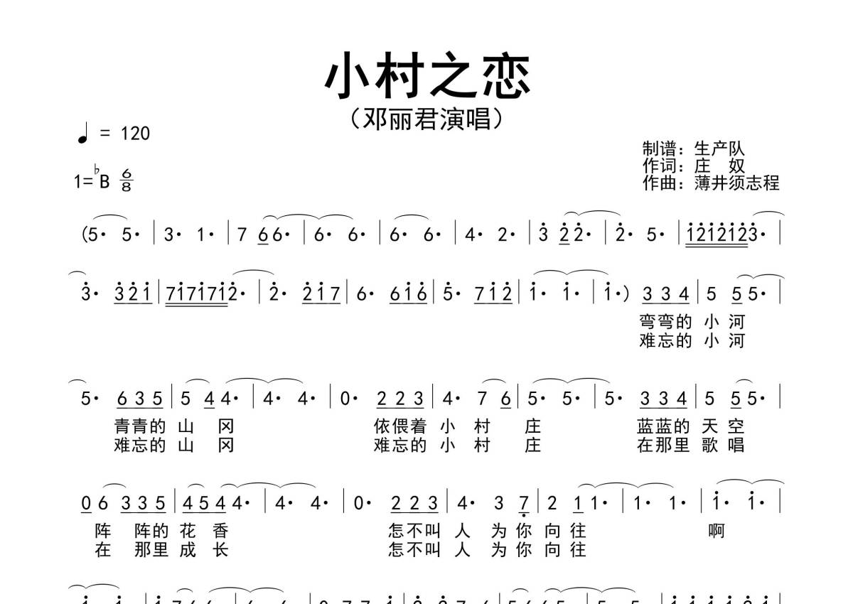 《小村之恋》是邓丽君演唱的一首歌曲,原版简谱,拍号为6/8拍,歌曲速度为每分钟120拍,这份简谱共有一张高清图谱,图谱由 @生产队 编配上传邓丽君演唱的经典歌曲《小村之恋》原版简谱。