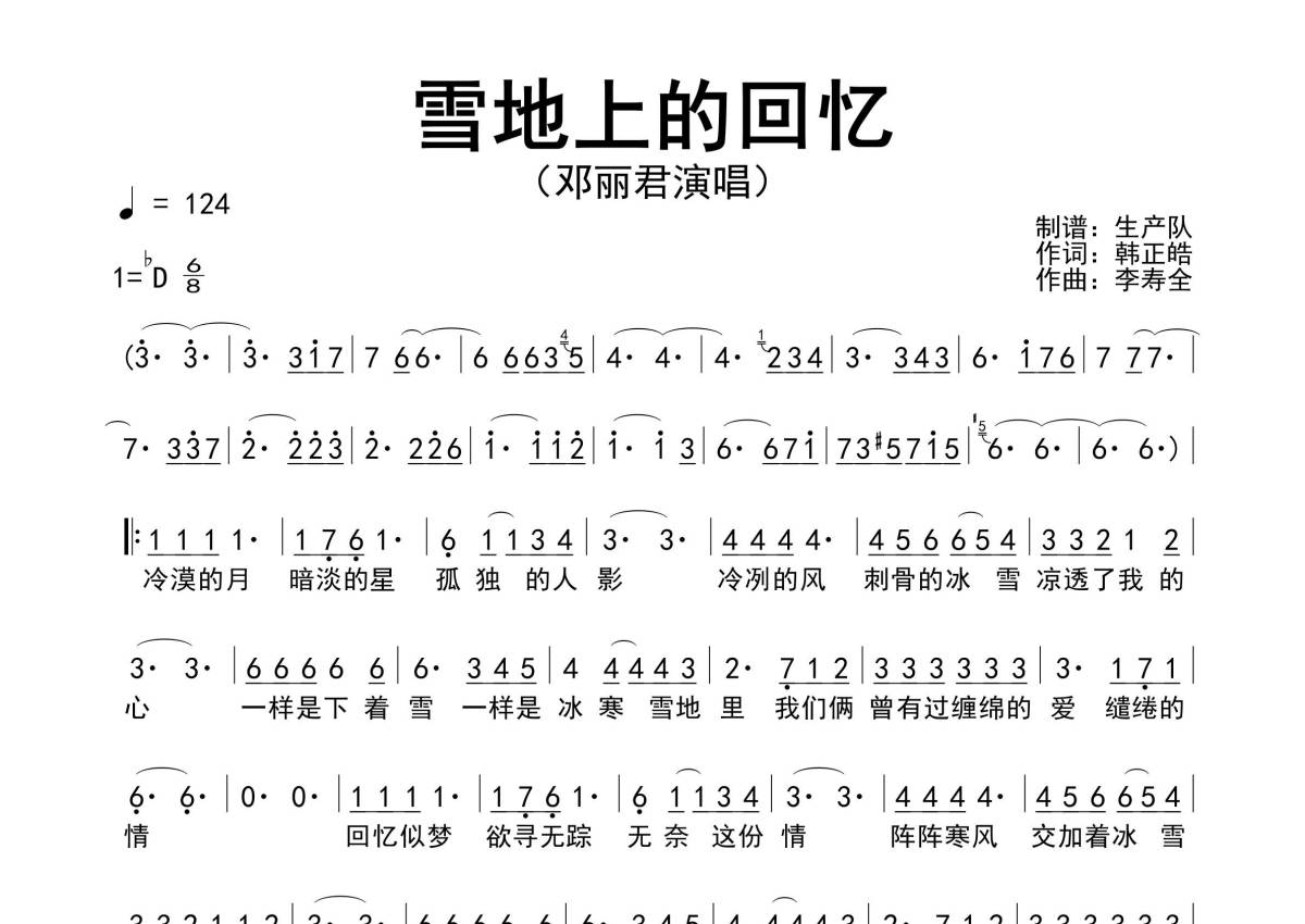 《雪地上的回忆》是邓丽君演唱的一首歌曲,原版简谱,拍号为4/4拍,歌曲速度为每分钟124拍,这份简谱共有一张高清图谱,图谱由 @生产队 编配上传邓丽君演唱的经典歌曲《雪地上的回忆》原版简谱。