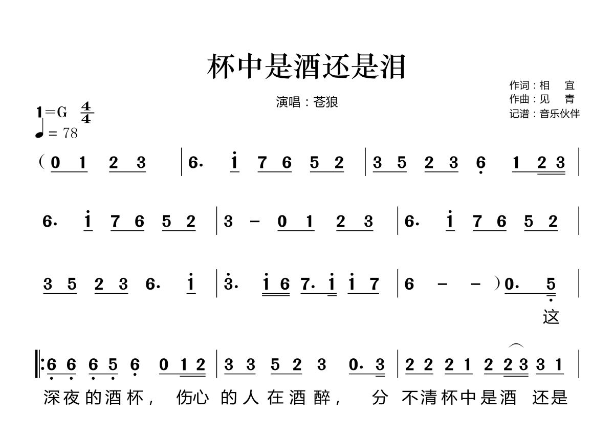 《杯中是酒还是泪》是苍狼演唱的一首歌曲,这份简谱共有两张高清图谱,图谱由 @音乐伙伴 编配上传。