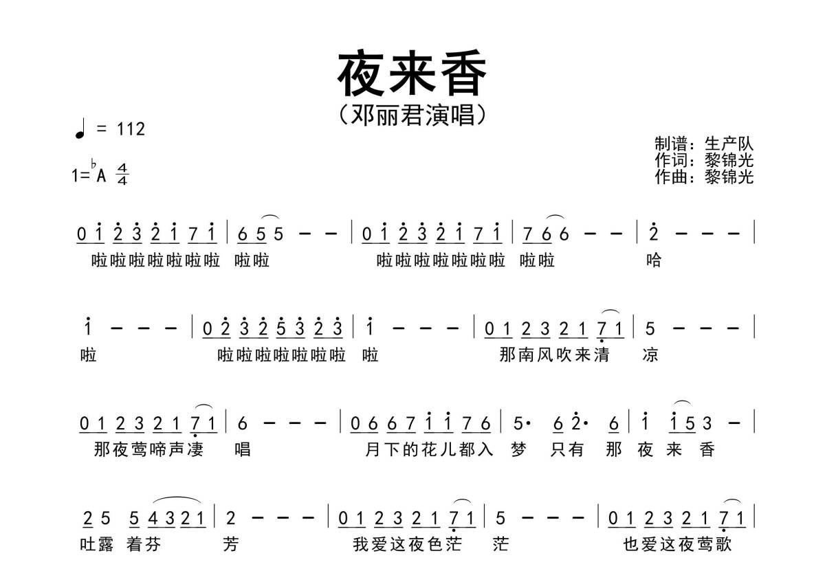 《夜来香》是邓丽君演唱的一首歌曲,原版简谱,拍号为4/4拍,歌曲速度为每分钟112拍,这份简谱共有一张高清图谱,图谱由 @生产队 编配上传邓丽君演唱的经典歌曲《夜来香》原版简谱。
