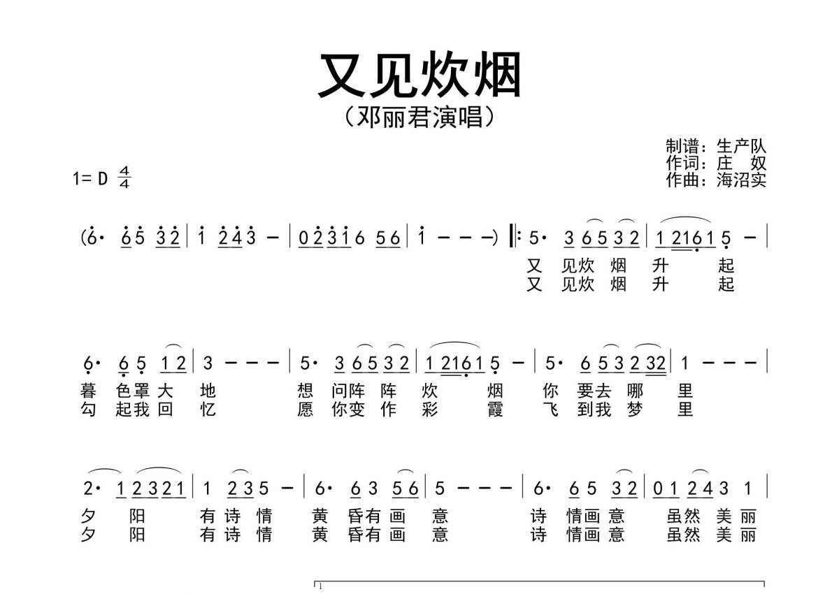 《又见炊烟》是邓丽君演唱的一首歌曲,原版简谱,拍号为4/4拍,歌曲速度为每分钟92拍,这份简谱共有一张高清图谱,图谱由 @生产队 编配上传邓丽君演唱的经典歌曲《又见炊烟》原版简谱。