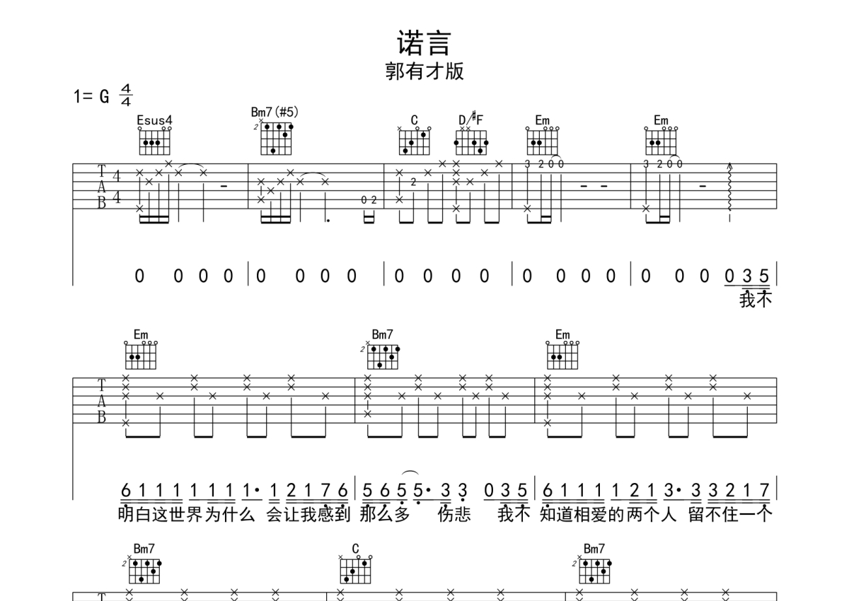 郭有才《诺言》吉他谱 - A调弹唱六线谱 - 完整版