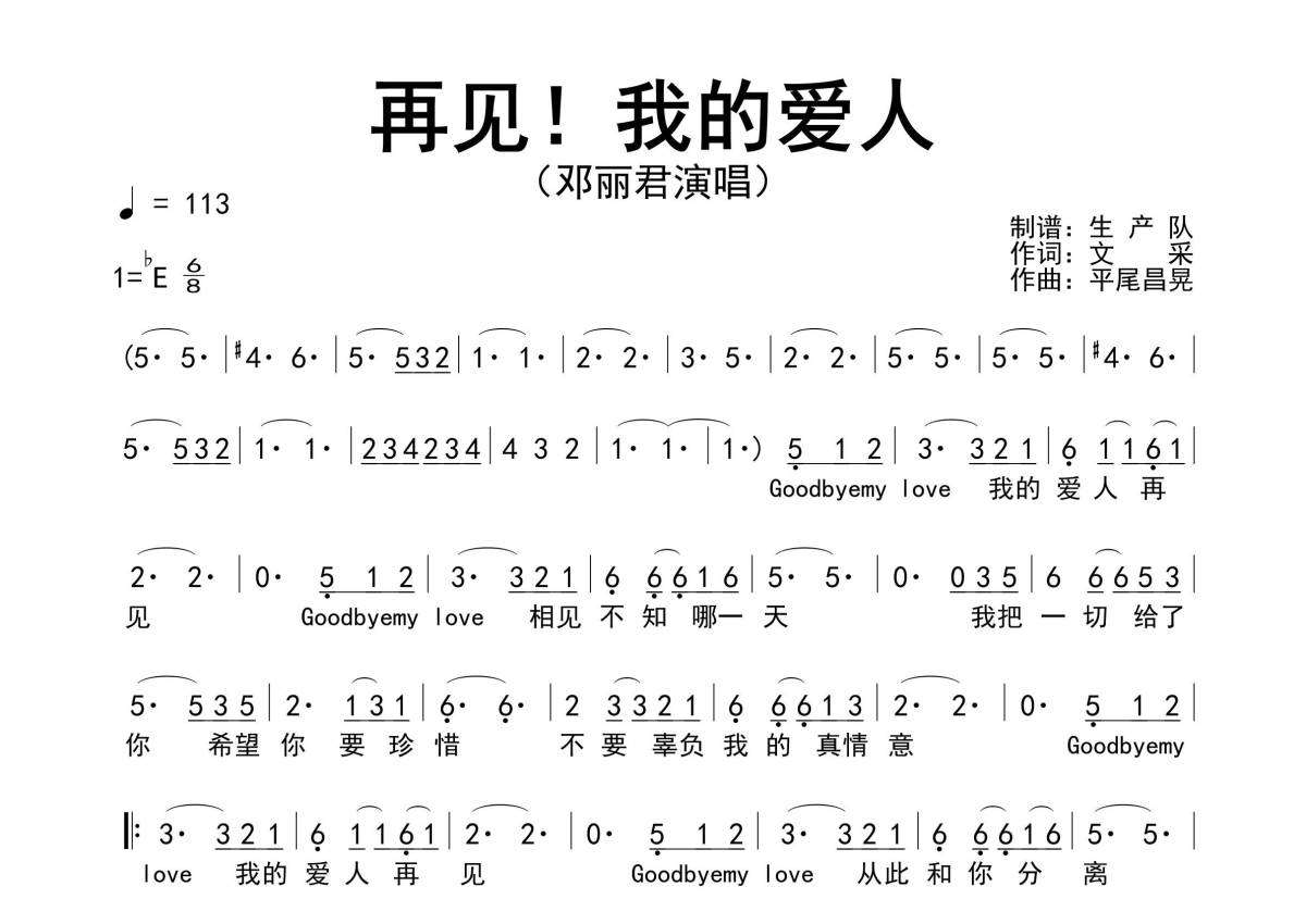 《再见!我的爱人》是邓丽君演唱的一首歌曲,原版简谱,拍号为6/8拍,歌曲速度为每分钟113拍,这份简谱共有一张高清图谱,图谱由 @生产队 编配上传邓丽君演唱的经典歌曲《再见!我的爱人》原版简谱。