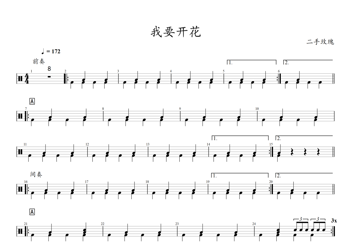 《我要开花》是二手玫瑰演唱的一首歌曲,拍号为4/4拍,歌曲速度为每分钟172拍,这份架子鼓谱共有三张高清图谱,图谱由 @音符喷血者 编配上传,图谱使用五线谱编配,使用这份我要开花架子鼓谱,你将能够轻松地敲打出这首二手玫瑰的我要开花,快来尝试吧。