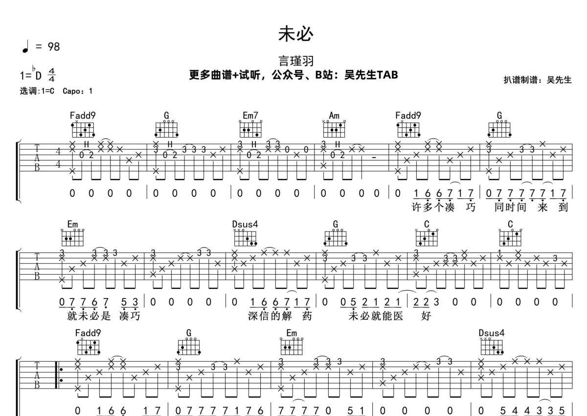 未必吉他谱 - 言瑾羽 - C调弹唱六线谱