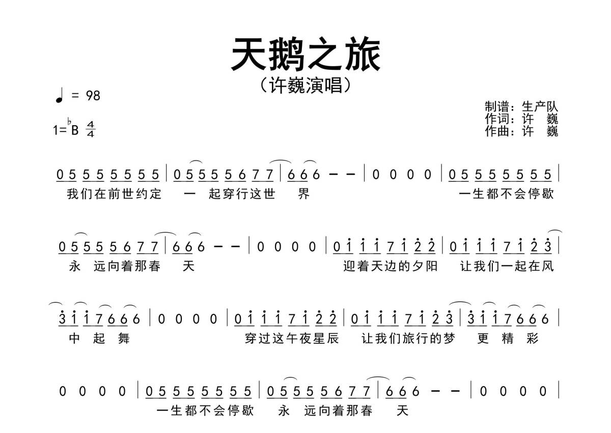 《天鹅之旅》是许巍演唱的一首歌曲,精编完美版,拍号为4/4拍,歌曲速度为每分钟98拍,这份简谱共有两张高清图谱,图谱由 @生产队 编配上传许巍演唱的经典歌曲《天鹅之旅》原版简谱,精编完美版!。
