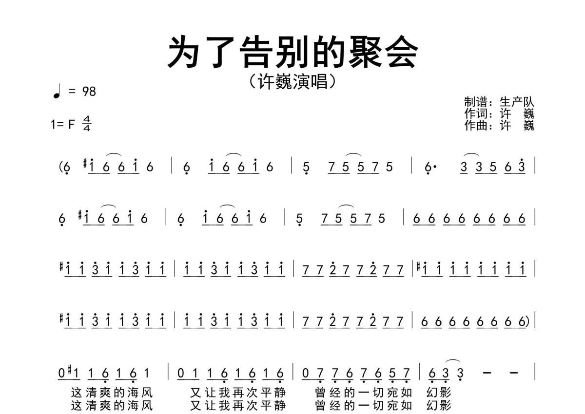 《为了告别的聚会》是许巍演唱的一首歌曲,精编完美版,拍号为4/4拍,歌曲速度为每分钟98拍,这份简谱共有两张高清图谱,图谱由 @生产队 编配上传许巍演唱的经典歌曲《为了告别的聚会》原版简谱,精编完美版!。