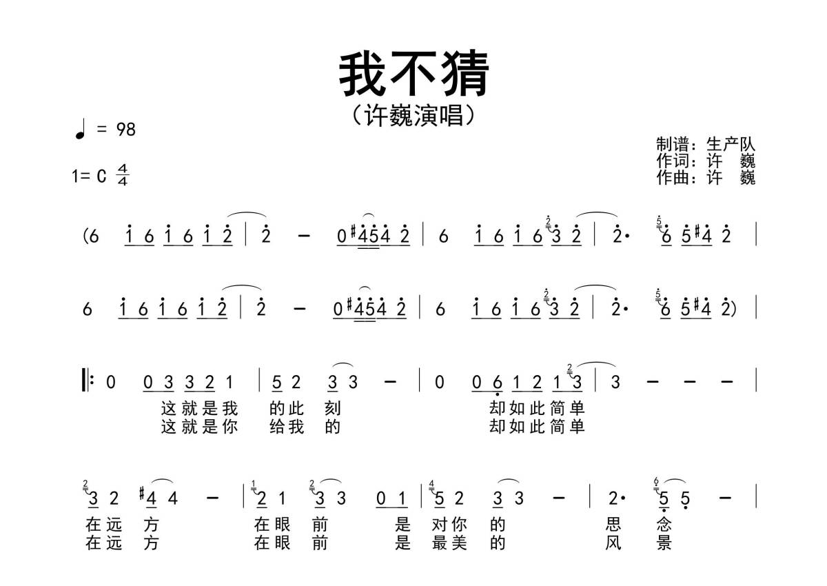 《我不猜》是许巍演唱的一首歌曲,精编完美版,拍号为4/4拍,歌曲速度为每分钟98拍,这份简谱共有两张高清图谱,图谱由 @生产队 编配上传许巍演唱的经典歌曲《我不猜》原版简谱,精编完美版!。