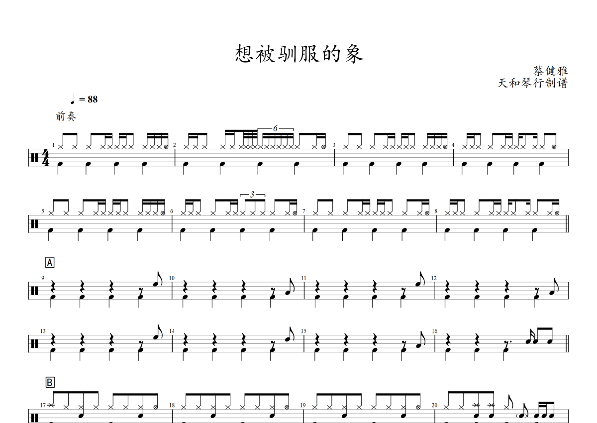 《被驯服的象》是蔡健雅演唱的一首歌曲,拍号为4/4拍,歌曲速度为每分钟88拍,这份架子鼓谱共有两张高清图谱,图谱由 @音符喷血者 编配上传,图谱使用五线谱编配,使用这份被驯服的象架子鼓谱,你将能够轻松地敲打出这首蔡健雅的被驯服的象,快来尝试吧。