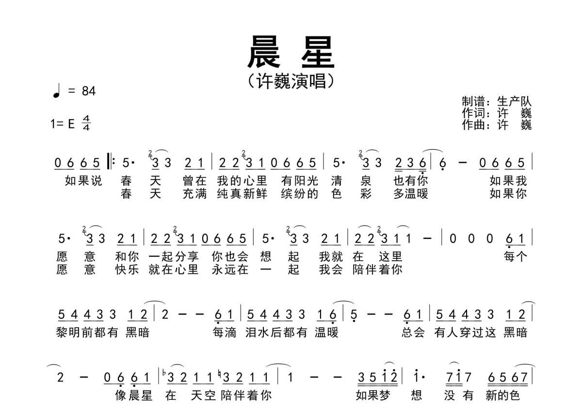 《晨星》是许巍演唱的一首歌曲,精编完美版,拍号为4/4拍,歌曲速度为每分钟84拍,这份简谱共有一张高清图谱,图谱由 @生产队 编配上传许巍演唱的经典歌曲《晨星》原版简谱,精编完美版!。