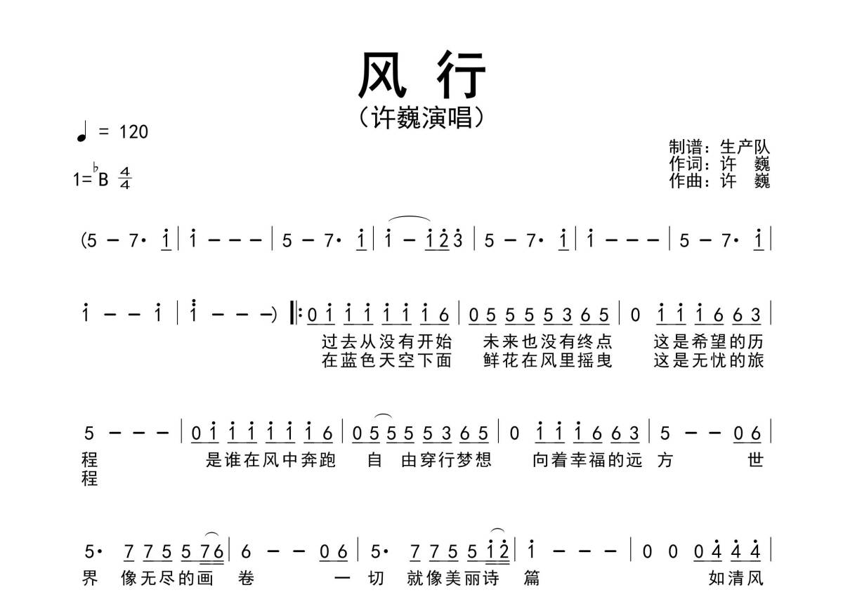 《风行》是许巍演唱的一首歌曲,精编完美版,拍号为4/4拍,歌曲速度为每分钟120拍,这份简谱共有一张高清图谱,图谱由 @生产队 编配上传许巍演唱的经典歌曲《风行》原版简谱,精编完美版!。
