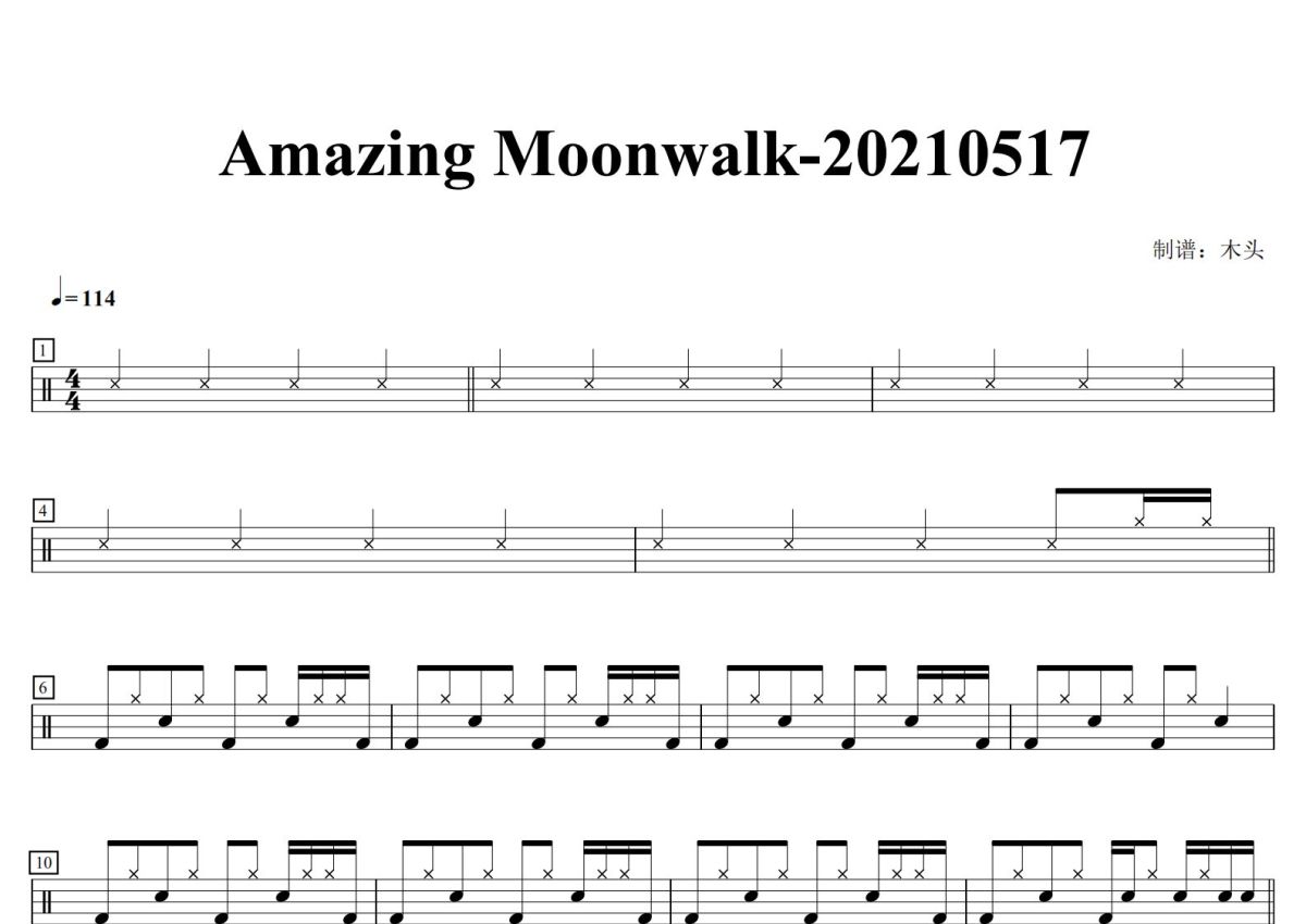 《Amazing Moonwalk》是坍缩乐队演唱的一首歌曲,这份鼓谱共有三张高清图谱,图谱由 @打鼓谱 编配上传,图谱使用五线谱编配,使用这份Amazing Moonwalk架子鼓谱,你将能够轻松地敲打出这首坍缩乐队的Amazing Moonwalk,快来尝试吧。《Amazing Moonwalk》是坍缩贝斯手大可老师的原创。乐队名—指一种量变转化为质变的物理现象。