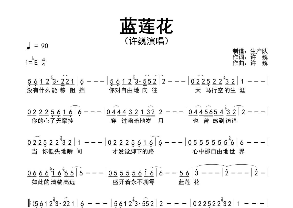 《蓝莲花》是许巍演唱的一首歌曲,精编完美版,拍号为4/4拍,歌曲速度为每分钟90拍,这份简谱共有一张高清图谱,图谱由 @生产队 编配上传许巍演唱的经典歌曲《蓝莲花》原版简谱,精编完美版!。
