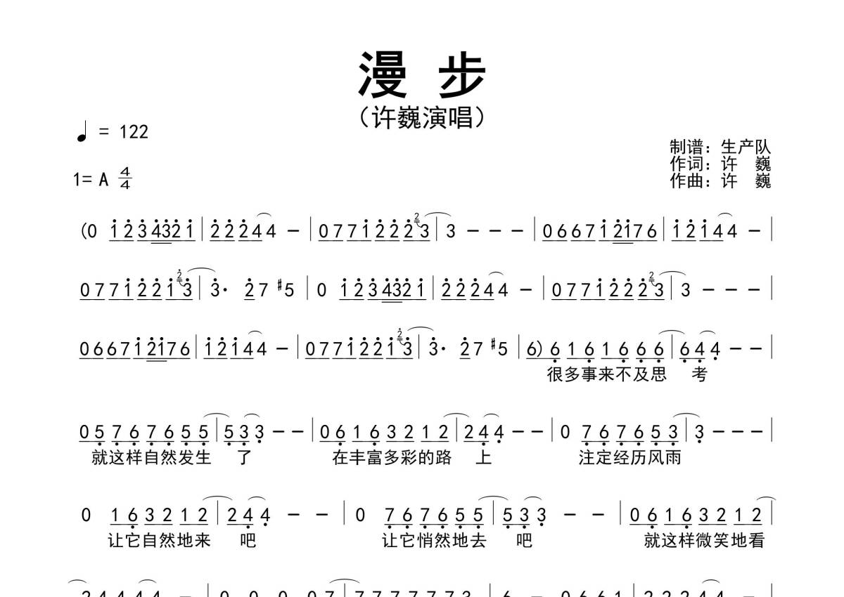 《漫步》是许巍演唱的一首歌曲,精编完美版,拍号为4/4拍,歌曲速度为每分钟122拍,这份简谱共有一张高清图谱,图谱由 @生产队 编配上传许巍演唱的经典歌曲《漫步》原版简谱,精编完美版!。