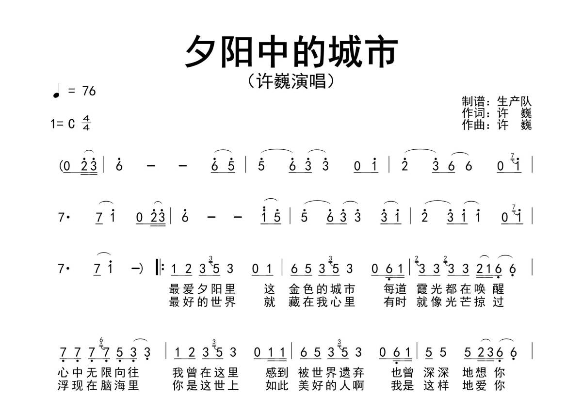《夕阳中的城市》是许巍演唱的一首歌曲,精编完美版,拍号为4/4拍,歌曲速度为每分钟76拍,这份简谱共有一张高清图谱,图谱由 @生产队 编配上传许巍演唱的经典歌曲《夕阳中的城市》原版简谱,精编完美版!。