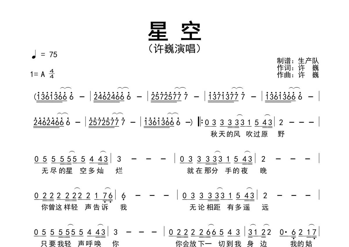 《星空》是许巍演唱的一首歌曲,精编完美版,拍号为4/4拍,歌曲速度为每分钟75拍,这份简谱共有一张高清图谱,图谱由 @生产队 编配上传许巍演唱的经典歌曲《星空》原版简谱,精编完美版!。