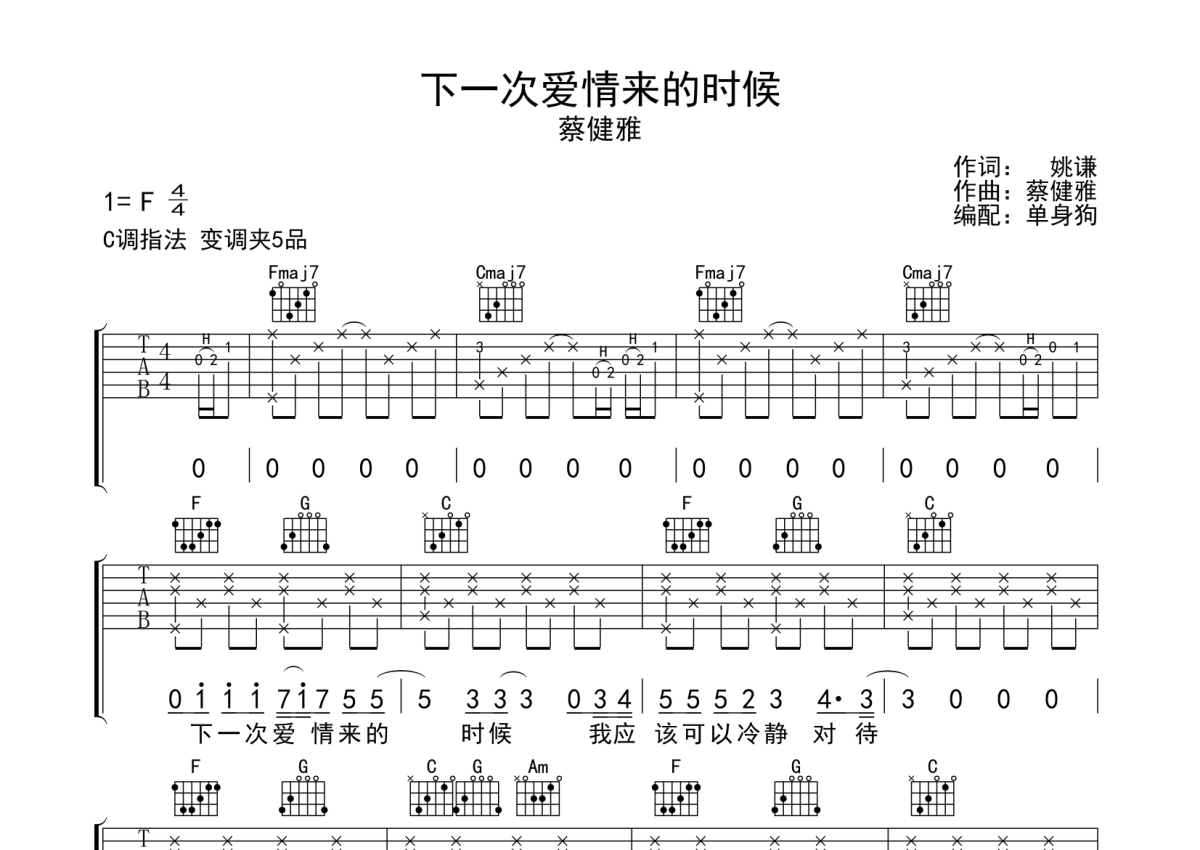 《下一次爱情来的时候》是蔡健雅演唱的一首歌曲,拍号为4/4拍,歌曲原调为F调,但由于原调指法比较难,为了方便弹奏,本吉他谱采用的是C调指法编配,变调夹5品弹奏即为原调,当然也可以根据自己的音域改变变调夹位置,或者通过改变和弦调性,以方便自己弹奏,这份吉他谱共有四张高清图谱,图谱由 @单身狗 编配上传,图谱使用六线谱编配,包含吉他和弦指法、简谱以及歌词部分,使用这份下一次爱情来的时候吉他谱,可以让你更加方便地掌握这首歌曲的弹唱技巧,快来尝试吧。