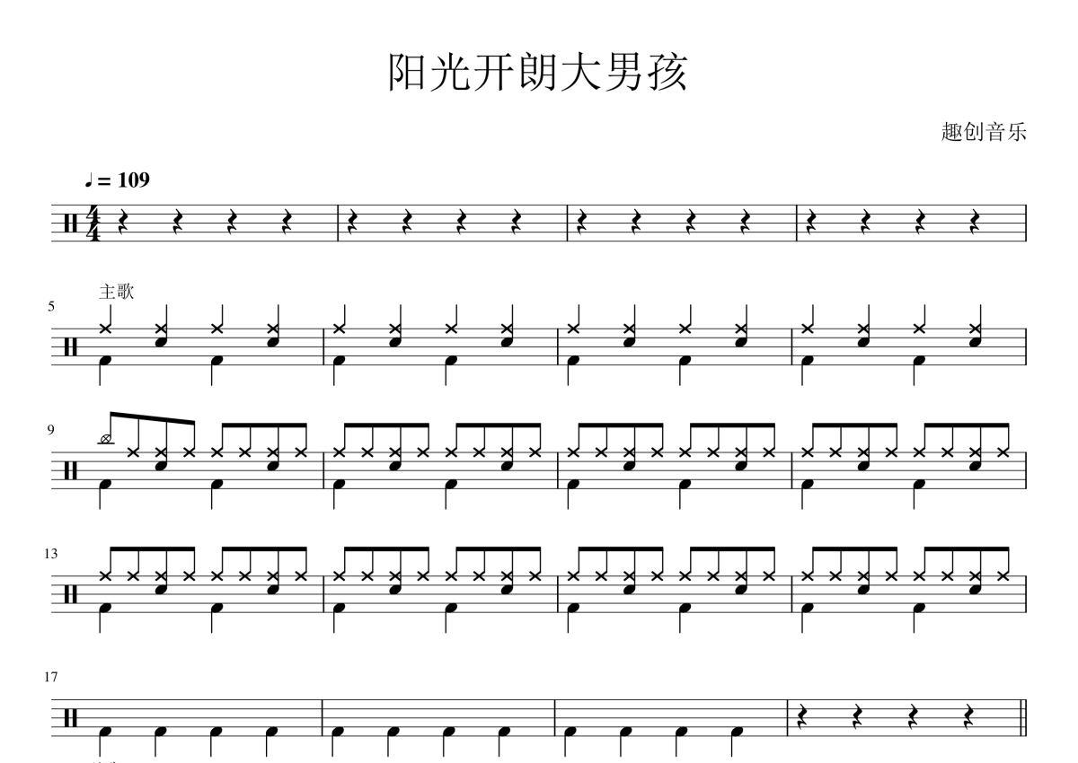 《阳光开朗大男孩》是卦者灵风演唱的一首歌曲,拍号为4/4拍,歌曲速度为每分钟109拍,这份架子鼓谱共有两张高清图谱,图谱由 @陈老师 编配上传,图谱使用五线谱编配,使用这份阳光开朗大男孩架子鼓谱,你将能够轻松地敲打出这首卦者灵风的阳光开朗大男孩,快来尝试吧。