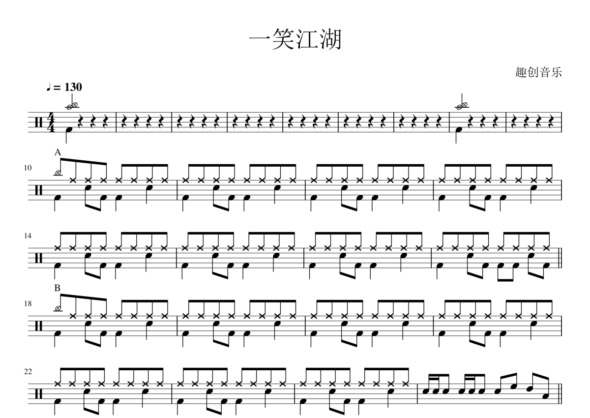 《一笑江湖(科目三)》是科目三演唱的一首歌曲,这份架子鼓谱共有两张高清图谱,图谱由 @陈老师 编配上传,图谱使用五线谱编配,使用这份一笑江湖(科目三)架子鼓谱,你将能够轻松地敲打出这首科目三的一笑江湖(科目三),快来尝试吧。