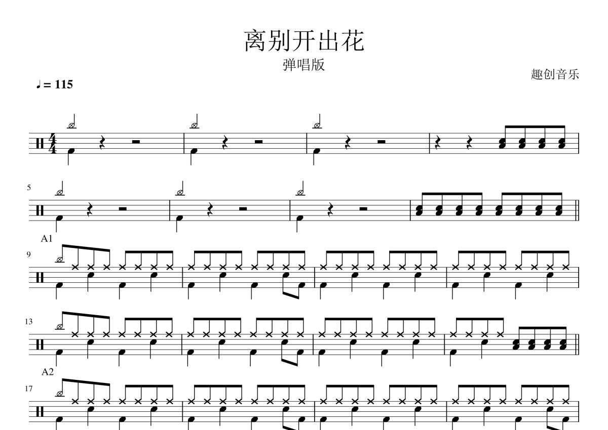 《离别开出花》是就是南方凯演唱的一首歌曲,这份架子鼓谱共有两张高清图谱,图谱由 @陈老师 编配上传,图谱使用五线谱编配,使用这份离别开出花架子鼓谱,你将能够轻松地敲打出这首就是南方凯的离别开出花,快来尝试吧。