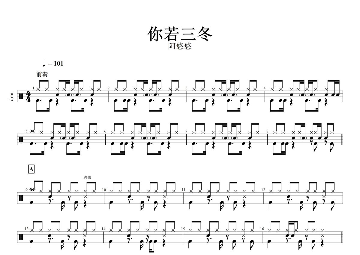 阿悠悠《你若三冬》鼓谱 - 架子鼓谱