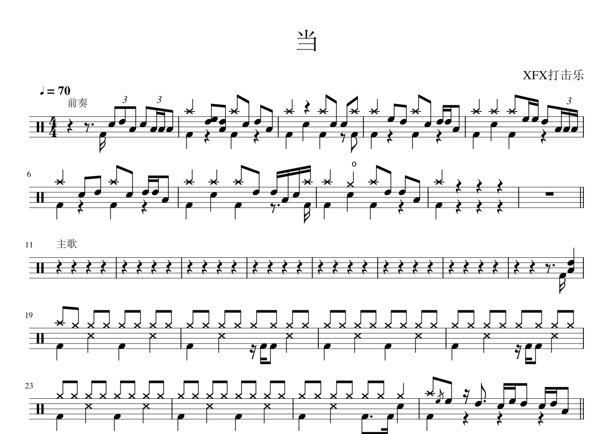 《当》是动力火车演唱的一首歌曲,拍号为4/4拍,这份架子鼓谱共有两张高清图谱,图谱由 @陈老师 编配上传,图谱使用五线谱编配,使用这份当架子鼓谱,你将能够轻松地敲打出这首动力火车的当,快来尝试吧。