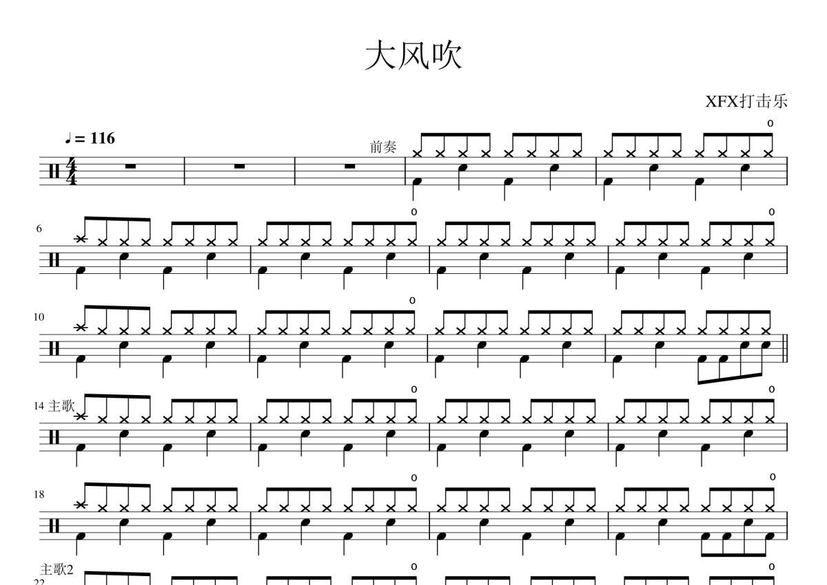《大风吹》是王赫野 刘惜君演唱的一首歌曲,拍号为4/4拍,歌曲速度为每分钟116拍,这份架子鼓谱共有两张高清图谱,图谱由 @陈老师 编配上传,图谱使用五线谱编配,使用这份大风吹架子鼓谱,你将能够轻松地敲打出这首王赫野 刘惜君的大风吹,快来尝试吧。